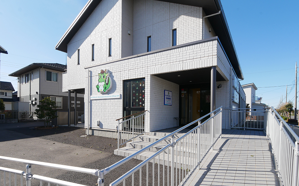 一軒家風のアットホームな外観で、タイル調の白い壁面が清潔感のある印象です。愛らしい竜のロゴマークが目印です。